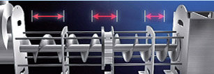 Unlike other type of screw dehtdrator, multi-disk type screw press drives with gearbox which installed both end side of screws. With this gearbox force, moving rings make pendulum motion by moving shaft which is attatched to gearbox and fixed ring is fixed by support beam. This moving rings and fixed rings are layered with washers between middle of rings. |